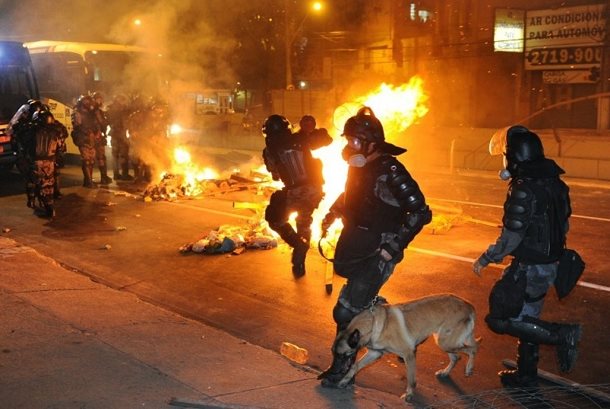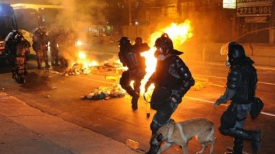 最近在巴西政府腐敗的示威遊行期間, 員警穿著平民決定參加這次抗議. 跪在道路上的火和飛他的槍在火焰中. 然後做一份檔,上面寫著: '我很慚愧我政府的, 我不想成為, 我感到羞愧什麼傳遞世界'. 然後, 抗議的喧囂的人群.