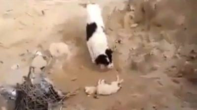 使用者從伊拉克昨天發佈一段視頻, 在其中一隻狗埋葬死去的小狗. 那條狗似乎知道這只小狗已經死了,並開始慢慢地用土蓋住. 狗也會經歷痛苦的情感, 但這種行為在這種情況下是不尋常的東西.