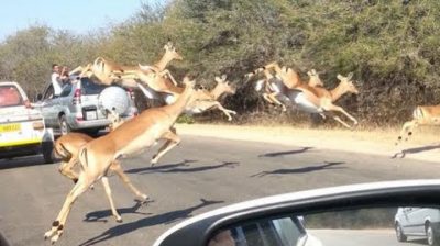 在南非克魯格國家公園野生動物, 遊客錄得兩個獵豹和羚羊之間空前射擊. 羚羊逃脫和保存進入遊客的汽車之一, 通過開放客運視窗. 指南 》 打開少許以後車門離開羚羊自由.