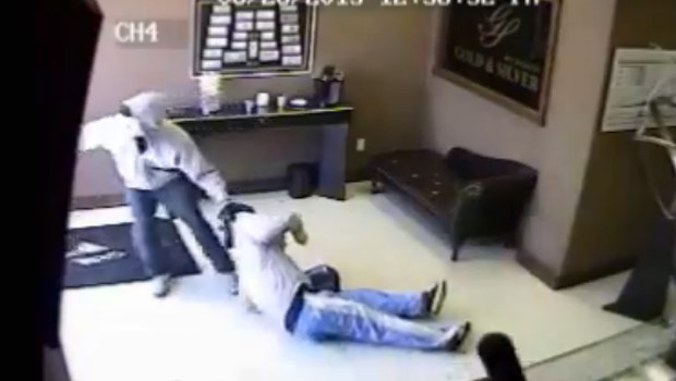 兩名劫匪手持一把刀和鐵撬進珠寶店在加拿大. 主人拿起一根棒球棒和擊中其中一人在離開他無意識的頭上.
