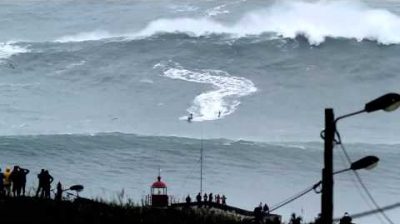 一場暴風雨在城裡 Nazare 葡萄牙衝浪與記錄波. 英國的 Andrew Cotton 和巴西的 Carlos Burle 在高達 30 米的海浪中衝浪,非正式地打破了世界紀錄.