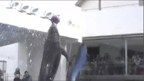 在水族館鎮在日本的佐世保, 兩只海豚已經學會了使在空中傳球!