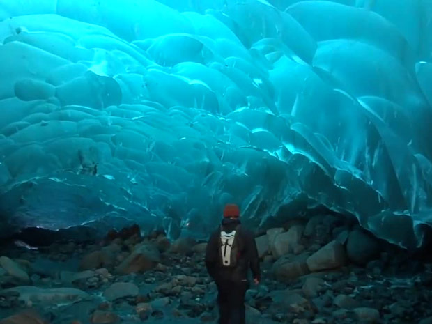 美麗的景象,在阿拉斯加門登霍爾冰川, 下創造了一個山洞裡,一條在流動的小河.