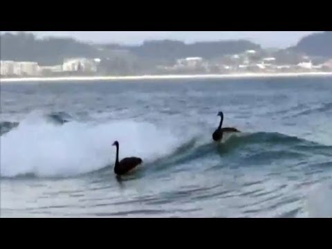 黑天鵝玩衝浪在黃金海岸在澳大利亞水域.