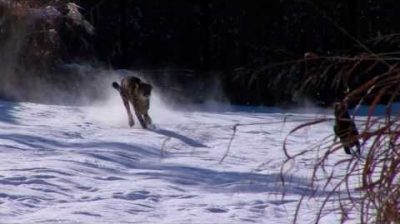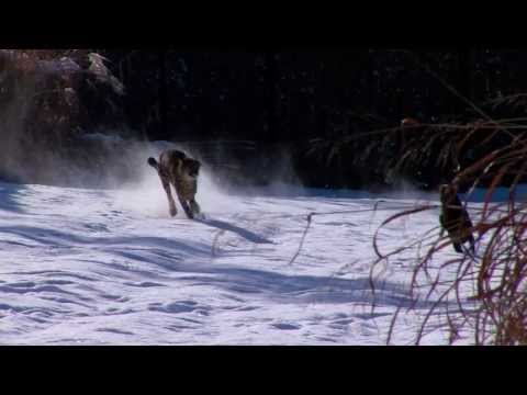 獵豹稀樹草原和狗一起在雪中的最大玩. 自 2012 年 9 月以來,這兩隻動物一直在辛辛那提動物園呆在一起,並成為了非常要好的朋友。.