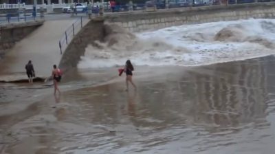 事故發生在一場暴風雨在西班牙的迪內羅球場海灘. 一個年輕的女人,沒有嚴重受傷從波幾百碼的地方漂流.