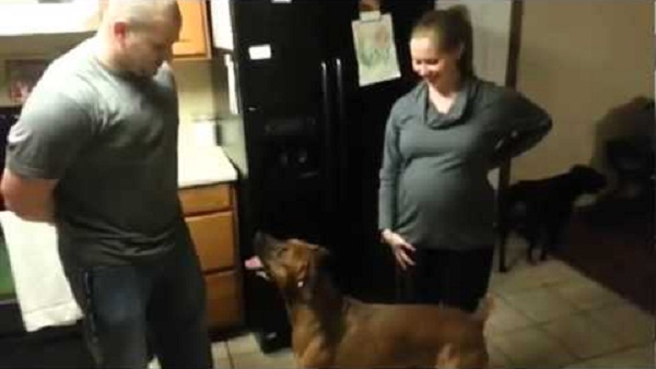 狗保護擁有者的准媽媽的肚子. 這是一個守門員!