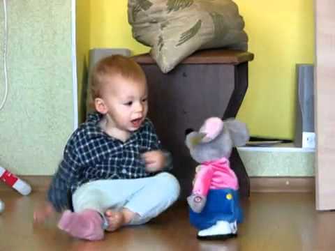 一個女人放置一個發條老鼠在地上. 眼看鼠標, 她的貓試圖通過跳上來抓住她。.
