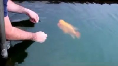 一條魚在土耳其的異常行為, 享受愛撫和一個男人一起玩. 有種魚被稱為'紅魔鬼' (雙冠麗螈).