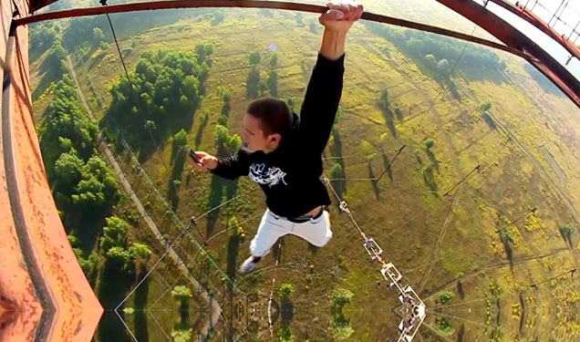 來自俄羅斯青年在他們慣常的職業: 爬上樓, 塔, 橋樑, 不顧危險,與完全無視他們的生活.