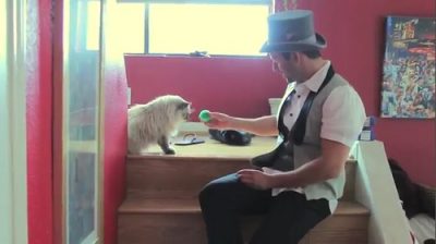 一個男人向他的貓展示著一枚硬幣的把戲, 然後重複.