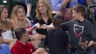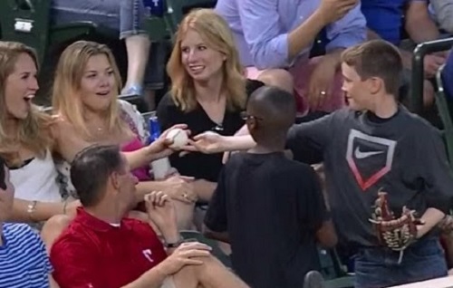 在德州遊騎兵與多倫多藍鳥隊的棒球比賽, Luis 維拉球員飛球到一個小男孩. 然而立即的孩子做一個有禮貌的動作和球給一個漂亮的女孩坐在他後面的人. 很好的移動, 但如果你看起來更好,你會看到它給在另一隻手並不是吸引美國舉行一個球. 主.