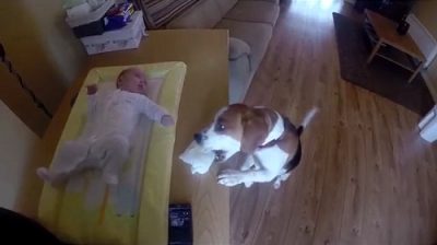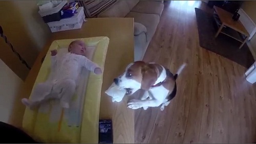 狗幫孩子換尿布