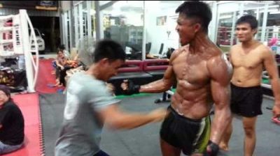 在健身房裡, 泰國拳擊手和之前 Banchamek 鍛煉腹肌, 使用它們作為一個拳擊袋. 頌巴 Banchamek 綽號'當然'是泰拳運動員, 誰在 8 歲時開始了他的職業生涯. 他參加了241場比賽,取得了208場胜利, 包括54個淘汰賽.