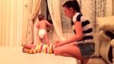 老人在俄羅斯試圖和他的狗愛好者一起玩. 災難二人組...