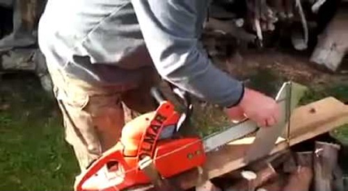 一個人使用臨時基地的鏈鋸, 這有助於他非常容易被削減木材在小塊.