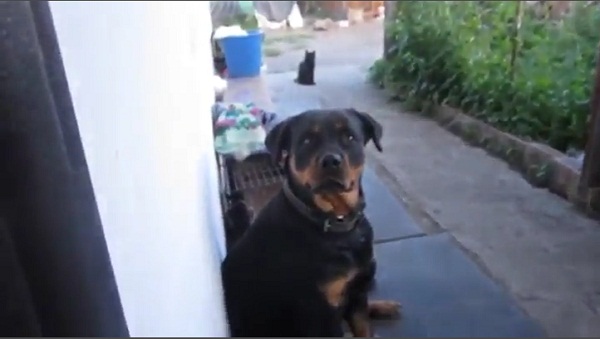 一隻獵犬小業主想嚇唬的面具. 不錯的主意.