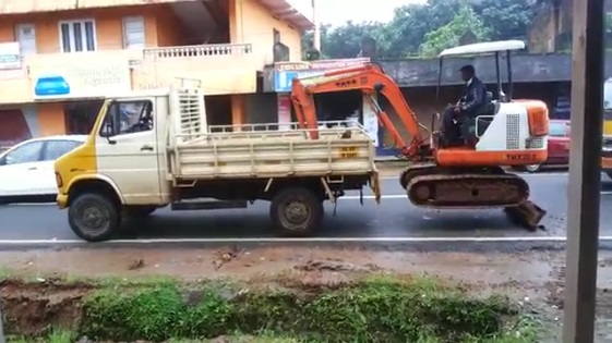 在 Pathanamthitta,印度的小鎮, 挖土機操作使用聰明的技術將裝載到一輛卡車的他的車.