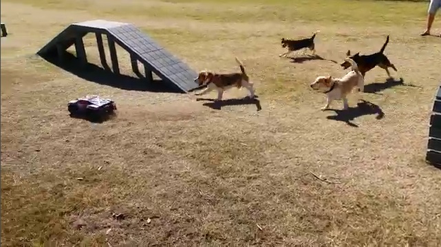 在澳大利亞的狗訓練中心, 8隻小獵犬群追遙控車玩得不亦樂乎.