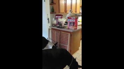 穗狀花序, 鸚鵡 kakatoya, 家裡有非常良好的合作關係,與他們的狗. 這裡演員趕上他的嘴,從包裝的幾片餅乾, 養活他們.
