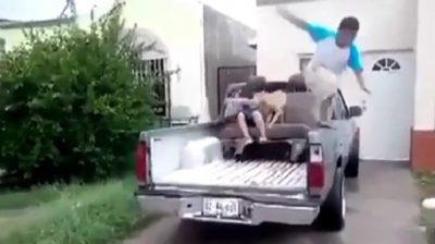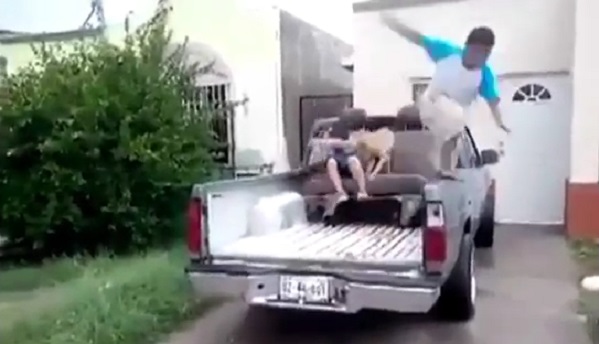 一個孩子絆跌,掉落在一輛皮卡車, 但它會有運氣的一部分.