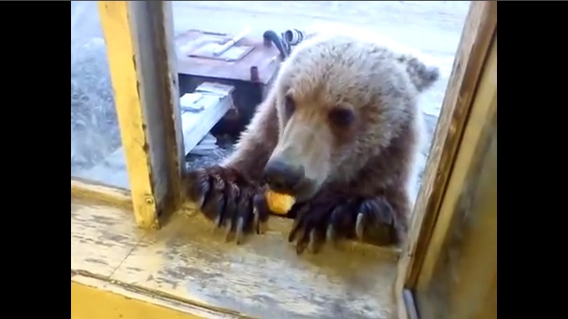 俄羅斯的科雷馬某建築工地, 工人們在一個非常友好的熊聞到了食物從視窗給餅乾.