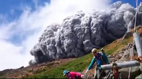 星期六, 2014 年 9 月 27 日, 王龍在日本爆發的火山. 一群正在火山健行的日本人被一股壯觀的火山灰羽流向他們飛來嚇了一跳…