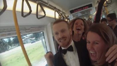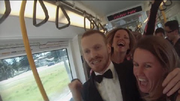 的 彼得 · 夏普 塞進一列火車在澳大利亞珀斯美化乘客天. 我向他們解釋它不討錢, 但想要為他們提供一點喜悅. 為此目的, 將開始跳舞調用那些想要陪著的馬車. 一旦音樂開始, 乘客將慢慢開始加入…