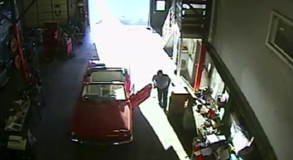 一個男人趕緊保存舊的經典的福特野馬,他忘了拉手刹車庫記錄中的安全攝像機. 這輛車然後開始危險地滾出車庫, 但是這個人設法把門關上,在司機座位的制動時間跳.