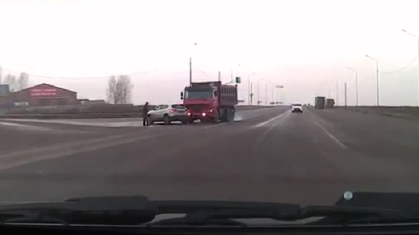 11 月 7 日,星期五, 俄羅斯, 一名行人很幸運,他的生活,當一場車禍. 而耐心地在一個路口, 一輛汽車與卡車右前方的碰撞. 沒有甚至移動的人, 保存為一個幾釐米.