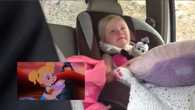 當他坐汽車旅行, 爸爸注意到他 2 歲的小女兒 Raegan 正在全神貫注地觀看她正在看的動畫片《花栗鼠歷險記》. 這是一隻小企鵝在那裡發現失去的母親的場景, 和那個小女孩不能忍住眼淚.