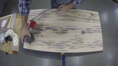 透明的光致發光粉與樹脂混合和填補空白在這天然的硬木柏樹, 創建一個唯一的表. 灰塵積累了陽光和在黑暗中發光淡的藍色.