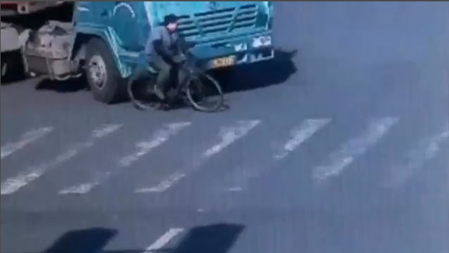 在中國寧波市路口, 一個騎車的人是非常幸運的卡車撞到他的時候. 它經過這輛大卡車的14個車輪下面, 並且奇跡般地避免被壓碎. 從這次事故只受輕傷倖免.