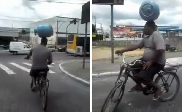 在聖保羅巴西, 一個騎自行車的人攜帶大型液化石油氣瓶在他的頭上保持平衡. 額外, 將甚至不與按下他的腳在街上停等交界處的汽車.