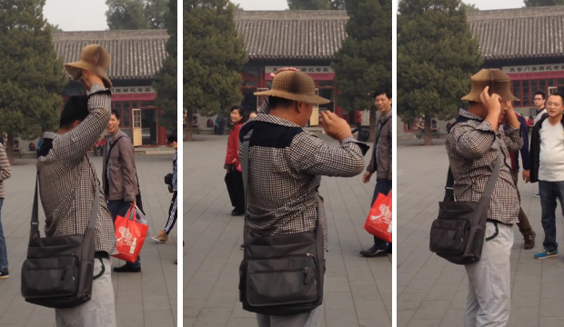 他在中國旅行期間, 一位遊客錄得 mikropwliti 頂奇怪的帽子與示範. 賣家有趣地展示了這頂「神奇」帽子的多種形狀.