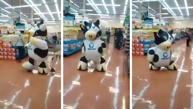 在墨西哥一家超市, 奶牛乳品公司 Alpura 吉祥物, 隨著 Nene Malo 的《Bailan Rochas Y chetas》音樂起舞. 裡面的服裝的人當然有很多的樂趣和行動.