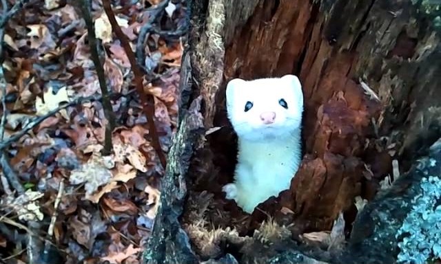 貂是一種小型的哺乳動物,像黃鼠狼,生活主要在歐亞大陸和北美洲. 這裡, 一個獵人會見在樹林裡可愛的貂, 藏在一棵樹的樹幹.