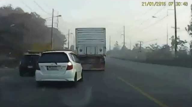 2015 年 1 月 21 日在泰國, 粗心的司機將嘗試超車開來迎面而來的卡車, 但是,看是否任何人都從相反的方向來. 突然面對一名電單車, 和將避免從字面上的車而不是頭髮, 失去了控制,他的車. 這是非常幸運的不發生碰撞,甚至沒有人受傷. 請注意,現場展開在泰國, 其中的驅動從左那裡獲取.