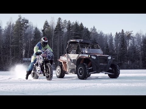 北極星 RZR 和鈴木 GSX-R 在結冰的湖面開心