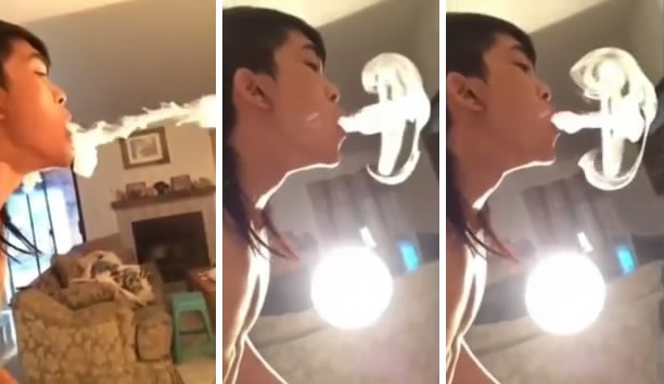 一位年輕使煙與令人印象深刻的把戲, 製作一隻水母在空氣中.