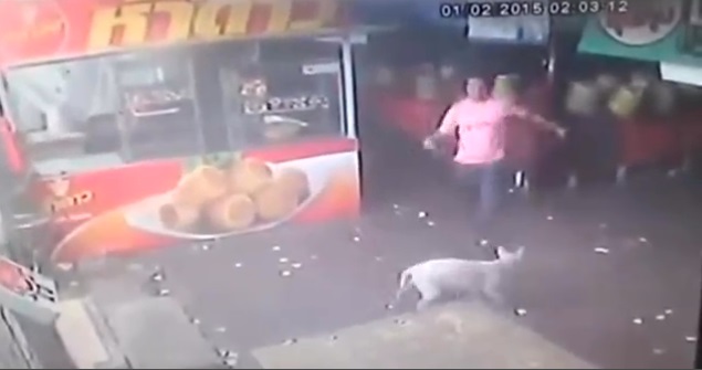 在一家餐廳的保安攝像機捕捉到一個男人, 當他試圖踢人走近他搖著尾巴的狗. 但是,當他撿起他的腿和標記, 那條狗避免擊中. 這個最後踢空氣, 而失足掉在地上的人.