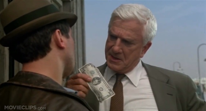電影「裸槍」中的一句非常有趣的台詞 (瘋狂的球) 1988 年, 警方偵探弗蘭克 Drebin (萊斯利 · 尼爾森) 試圖透過與碼頭工人交換…賄賂來了解訊息.