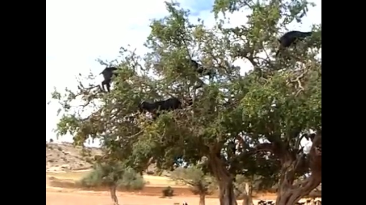摩洛哥西南部, 這並不奇怪,對當地人來說,在樹上看到山羊, 雖然那位遊客羅伯特 · 比爾就相當不尋常的景觀. 馬拉喀什和索維拉在摩洛哥之間的旅行, 羅伯特記錄了 16 只山羊爬到高大的樹頂. 但山羊不做娛樂攀爬. 爬進一個非常特別的樹, 摩洛哥堅果, 吃的水果.