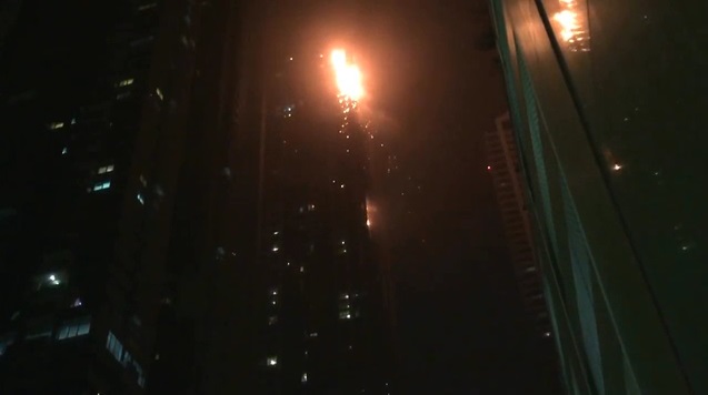 2015年2月20日,星期五,迪拜, 壯觀的火災爆發出來,在這座城市中最大的摩天大樓之一, 被稱為“火炬”. 大火從第 50 層的摩天大樓, 有80層,高度348米. 打二十層和數百人撤離大樓. 暫無人員傷亡.