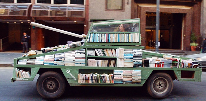 在布宜諾斯艾利斯阿根廷, 藝術家 Raul Lemesoff 打造了“大眾教學的武器”. 這是一輛 1979 年的福特獵鷹,它被改裝成一輛主戰坦克,用於向路人分發免費書籍。. 書在交流中給你讀的諾言. Raul 說他不是為了錢,還是為了出名, 而是因為喜歡. “我的任務太危險了”, 他說:. “我以一種非常愉快和有趣的方式攻擊別人”. 一個很好的倡議,拍攝七喜 #FeelsGoodToBeYou 運動的説明.