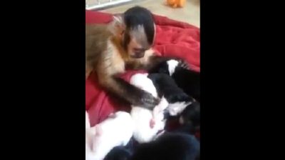 在俄羅斯野生動物保護區, 一個女人走近並撫摸一隻狒狒。. 瀑布. 那不是...