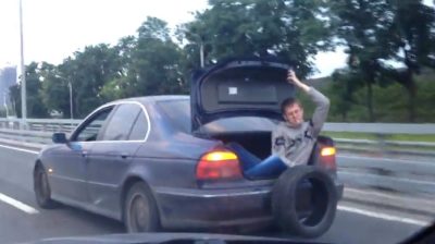 在俄羅斯的街道上, 一群朋友發明了一種新的技術來拖一輛帶有損傷. 其中一人坐內持有一種輪胎在保險杠的高度的樹幹, 所以,可以從後面推另一輛車,然後.