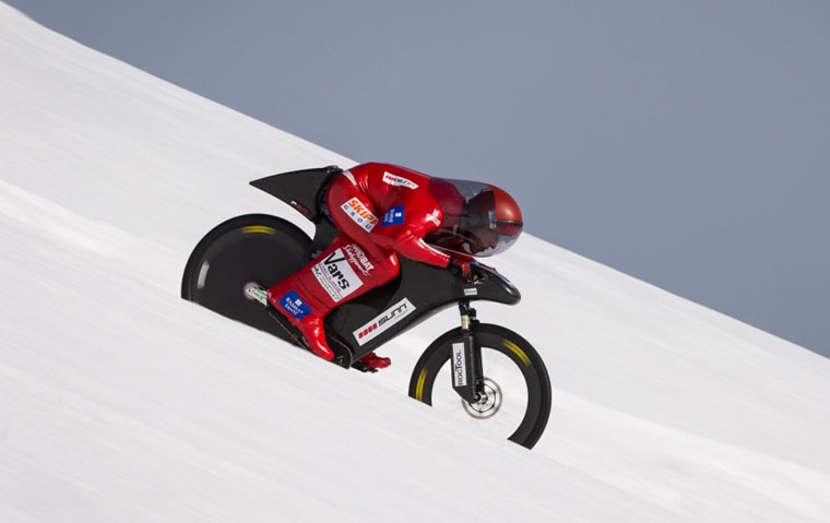 Eric 巴羅內打破自己世界速度紀錄騎著自行車在 Vár 山, (法國阿爾卑斯山) Chabrieres 速度跟蹤. 經過三年的準備, 在54歲和他的團隊達到了223,每小時3公里.