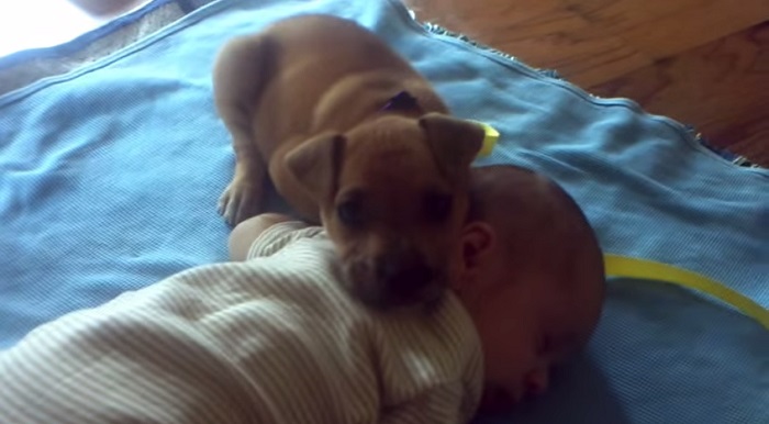 作為一個寶寶正在睡覺, Lilo 的小狗坐在旁邊嗜睡的戰鬥. 試著睜開, 但我不會抗拒,. 將把他的頭放嬰兒和將會下降,而睡.