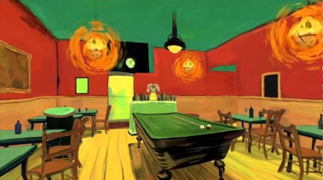 動漫設計師麥肯齊供應從布魯克林, 將文森特梵高 (Vincent Van Gogh) 的“夜間咖啡館”轉變為具有動畫人物和物體的 3D 環境. 虛擬場景是分別以原始表的元素,然後將他們變成三維物體通過軟體. 要填充的地方不是在原始表中可見的那間房, 然後添加幾個額外, 作為一名鋼琴家演奏音樂酒吧附近.